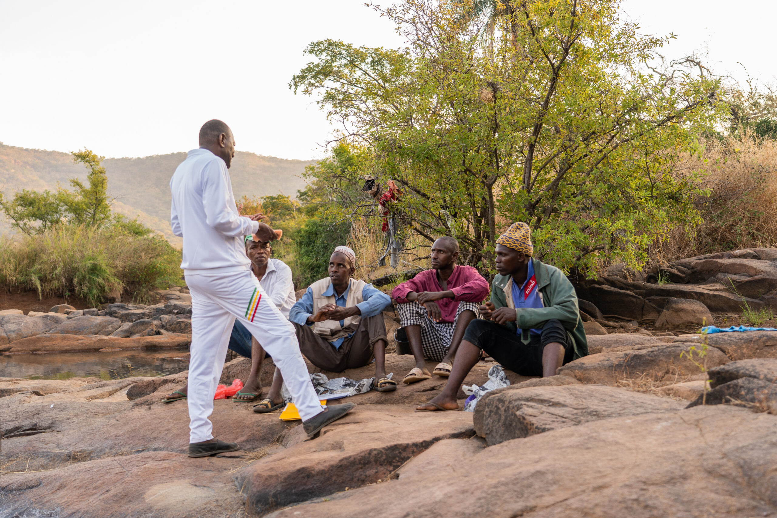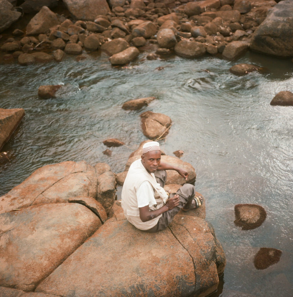 Ten kilometers from the border of Guinea, Saliou Toure sits on the bank of the fast flowing Gambia river for eleven hours. His facial expression is serious, his eyes are focused, and his slacks are meticulously rolled up, leaving his legs visible. With a quick hand motion, he traps a black fly in a glass tube as it lands on his leg. “We are careful and committed because flies can leave the other side of the border to come here,” he says. Toure is the leader of a team of four fly collectors from Yamoussa, Senegal; they were asked by the village chief to be volunteers in 2006.